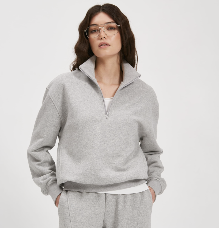 Cвитшот умеренного объема, прямого силуэта, со спущенным плечом. Горловина с воротником-стойкой и застежкой на тесьму-молнию. Боковые швы смещены на перед. Спинка с фигурной линией кокетки. Пояс отрезной. Рукав одношовный длинный. Низ рукава с притачной манжетой. По боковым и плечевым швам, пройме, шву притачивания манжет и пояса проложена отделочная строчка, шириной 5 мм. Рамка под молнию отстрочена отделочной строчкой шириной 5 мм.