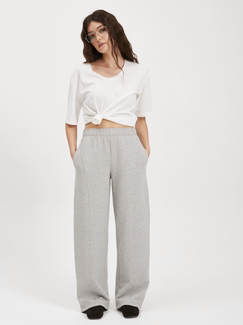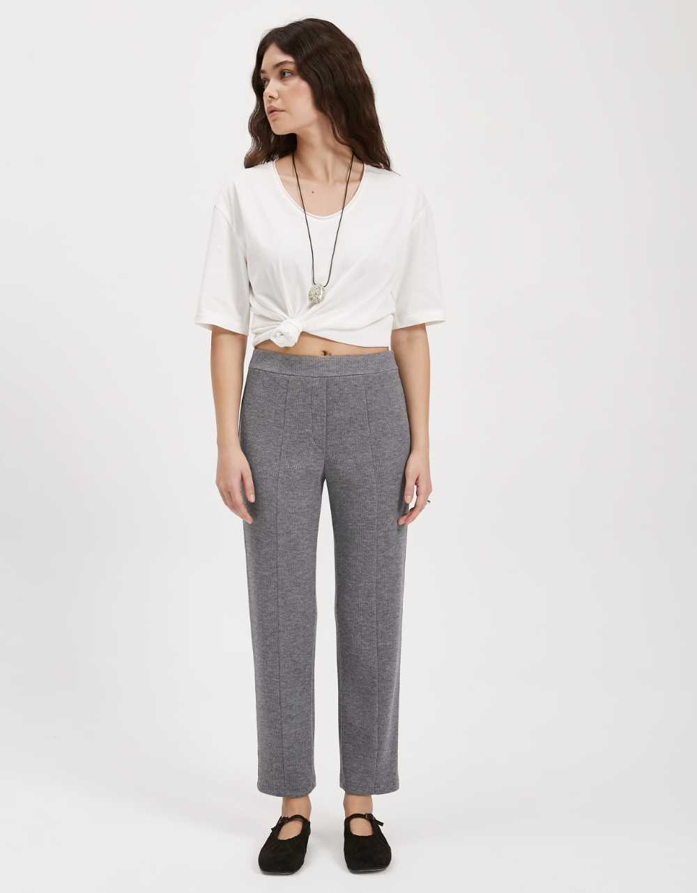 Брюки умеренного объема, длиной до щиколотки, с небольшим заужением к низу. Передние и задние половинки с вертикальными рельефными швами. Верхний край пояса располагается ниже естественной линии талии на 3 см. Шов сидения не спущен.