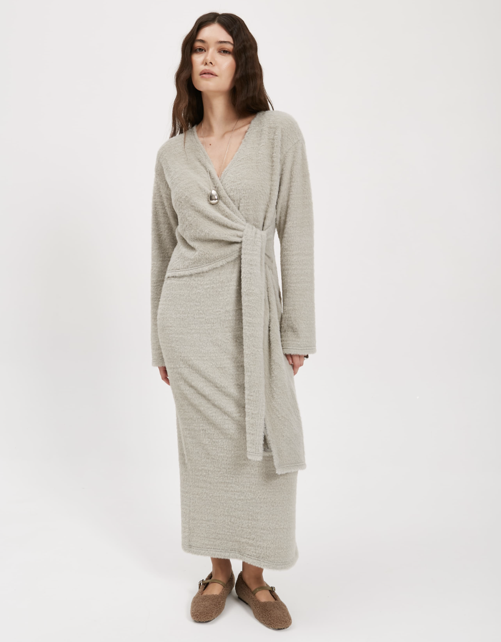Платье прямого силуэта длиной миди со спущенной линией плеча. Перед изделия асимметричный, с запахом: правая часть выполнена с цельнокроеным поясом, левая часть с втачанным поясом по боковому шву. Спинка со средним швом. Рукава одношовные, длинные. Срезы низа изделия, рукава, горловины и пояса обработаны на плоскошовной машине.