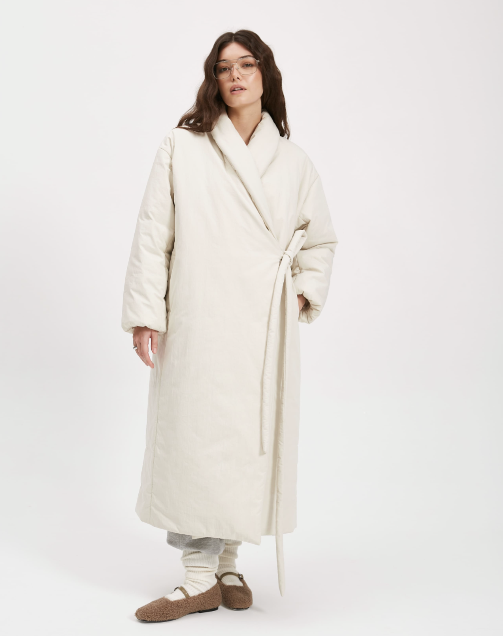 Утеплённое пальто большого объёма, прямого силуэта, длины миди. Модель со спущенной линией плеча и шалевым воротником. Застёжка на запах, фиксируется двумя внешними и двумя внутренними завязками. По переду выполнен отрезной бочок, в рельефном шве расположен карман.